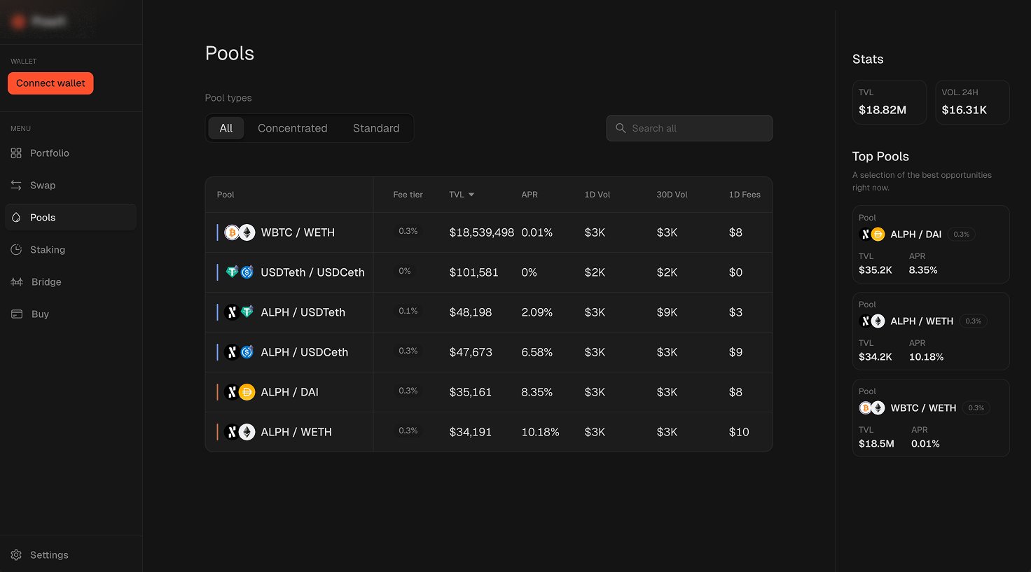 Powfi sẽ đóng vai trò là “benchmark” do chính giao thức sở hữu, được thiết kế để phô diễn đầy đủ năng lực của công nghệ sharding Proof-of-Less-Work của Alephium. Trọng tâm của Powfi là một sàn DEX theo mô hình Concentrated Liquidity Market Maker (CLMM), nhưng những gì Powfi mang lại còn nhiều hơn những gì bạn đang nhìn thấy.